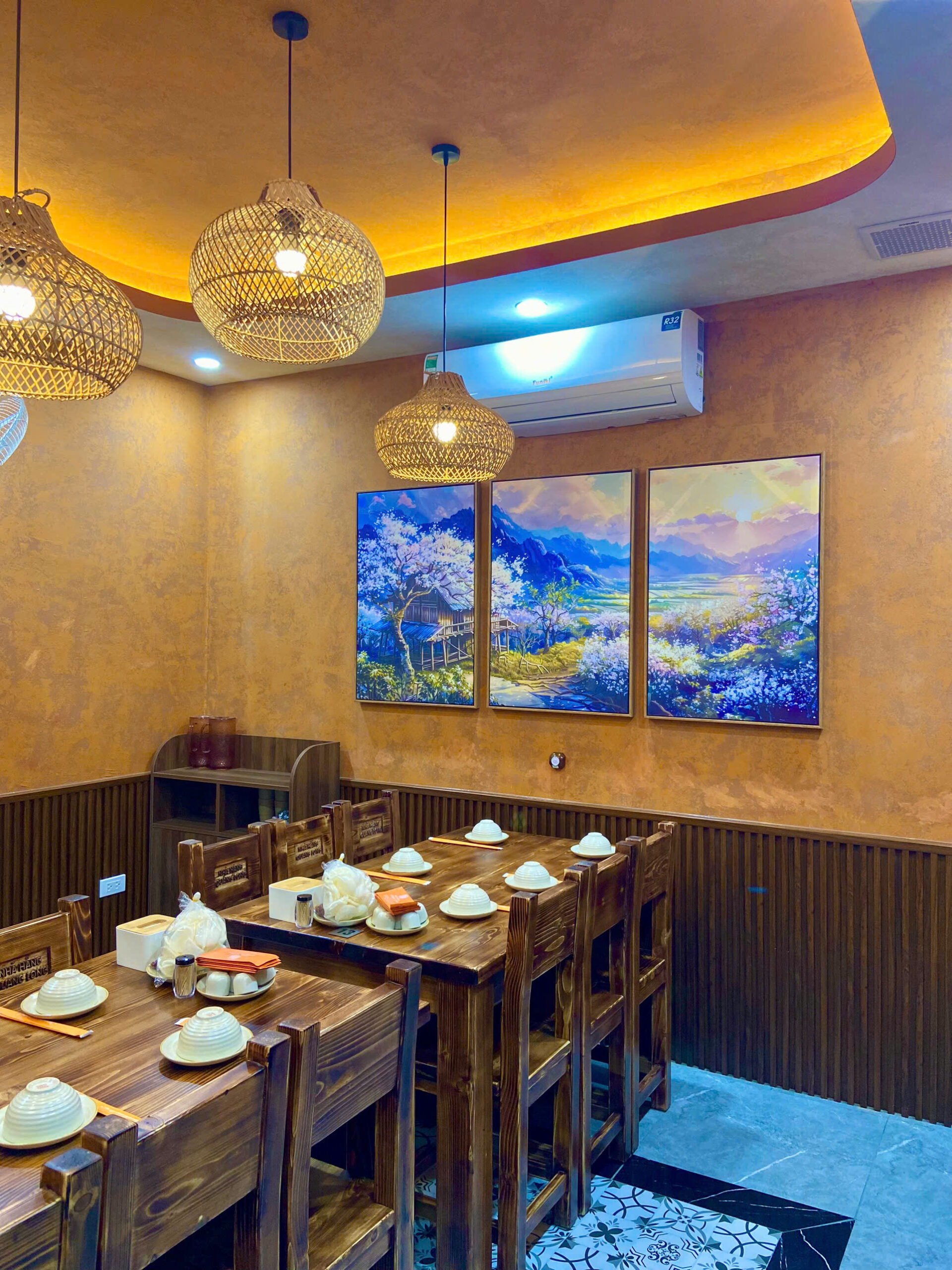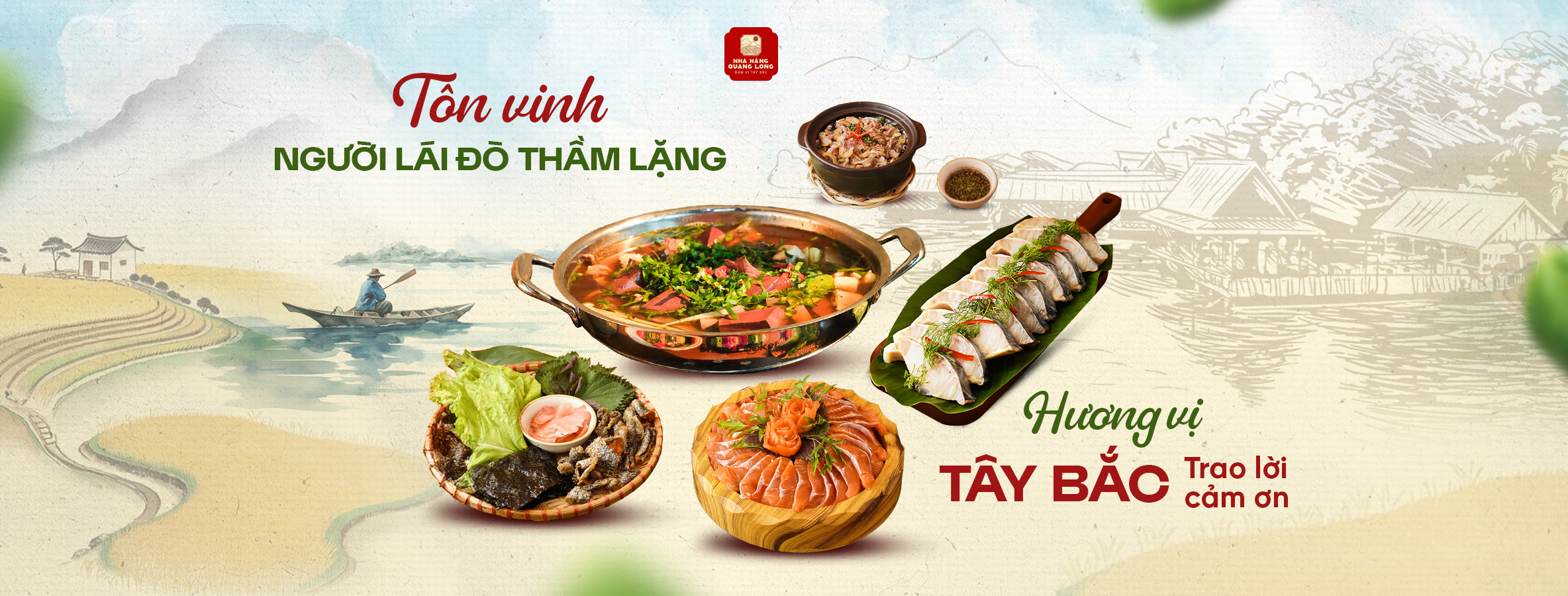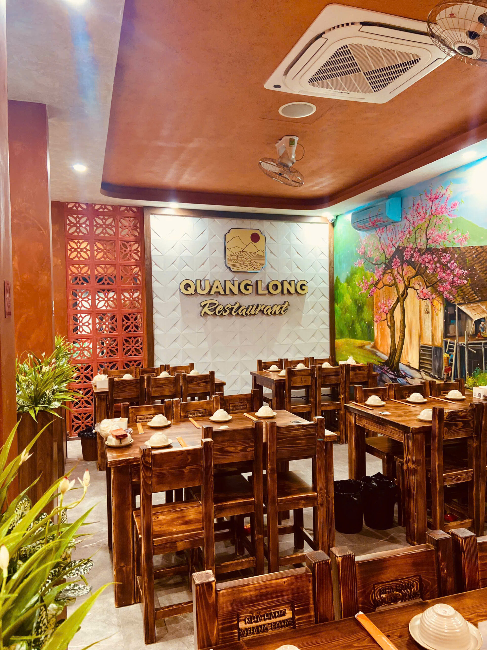 Nhà hàng Quang Long sở hữu không gian vô cùng độc đáo, nơi hội tụ tinh hoa ẩm thực vùng núi kết hợp với nét thiết kế hiện đại. Không gian nhà hàng rộng rãi, tràn ngập ánh sáng, kết hợp giữa nội thất gỗ tự nhiên và đèn trang trí mây đan, tạo cảm giác ấm cúng mà hiện đại. Các mảng tường được điểm xuyết bằng họa tiết thổ cẩm và tranh phong cảnh Tây Bắc, mang đến hơi thở vùng cao ngay giữa thành phố.